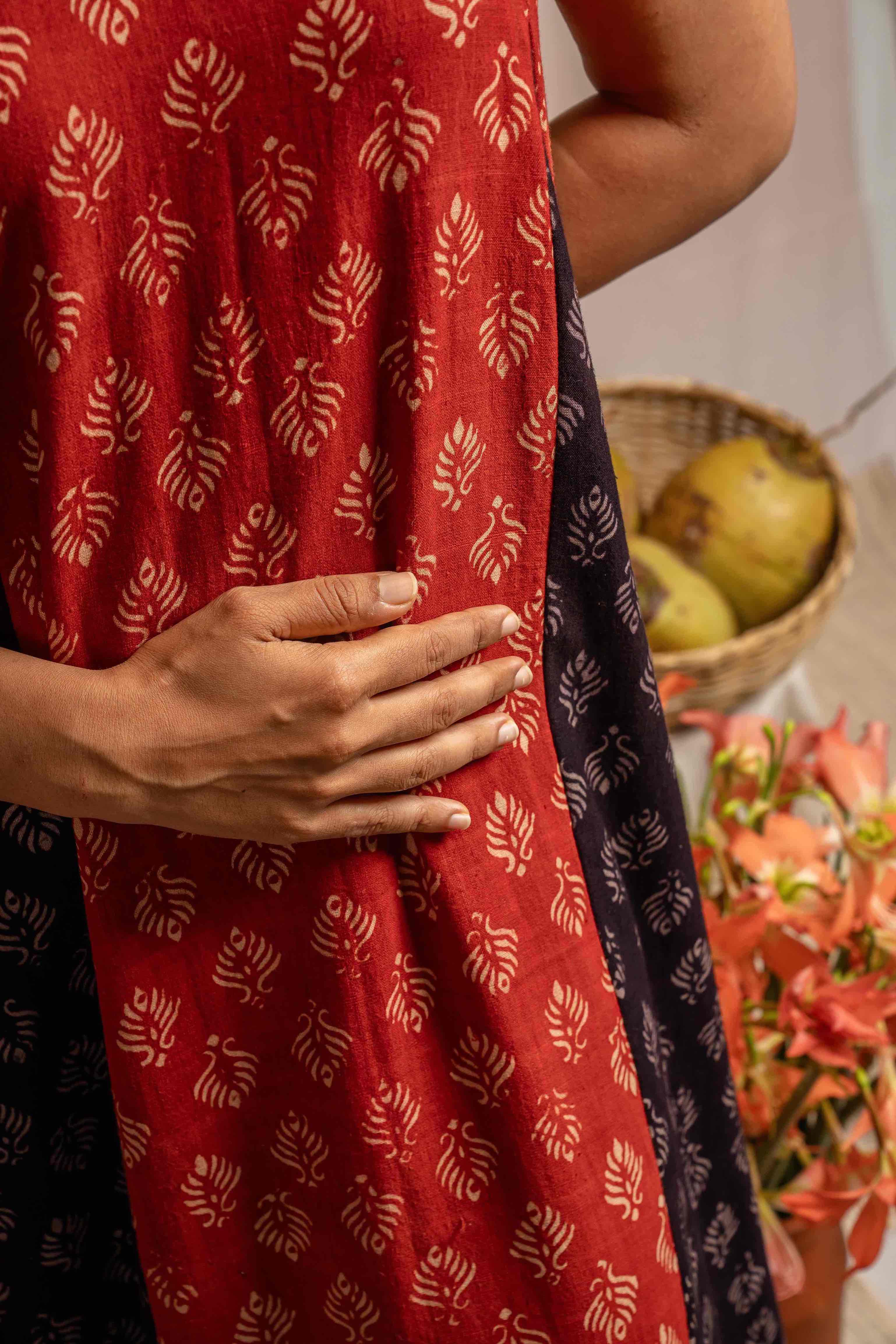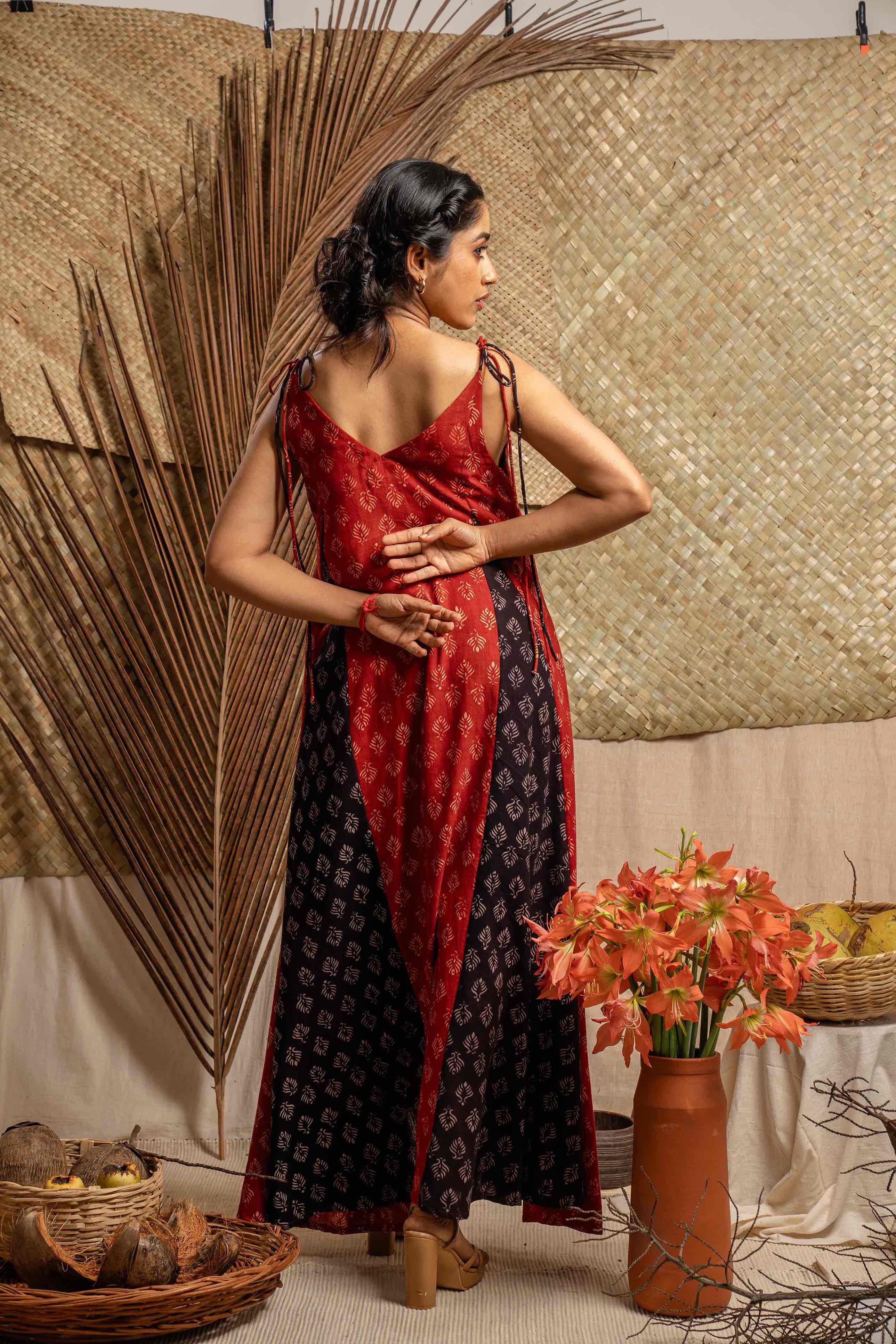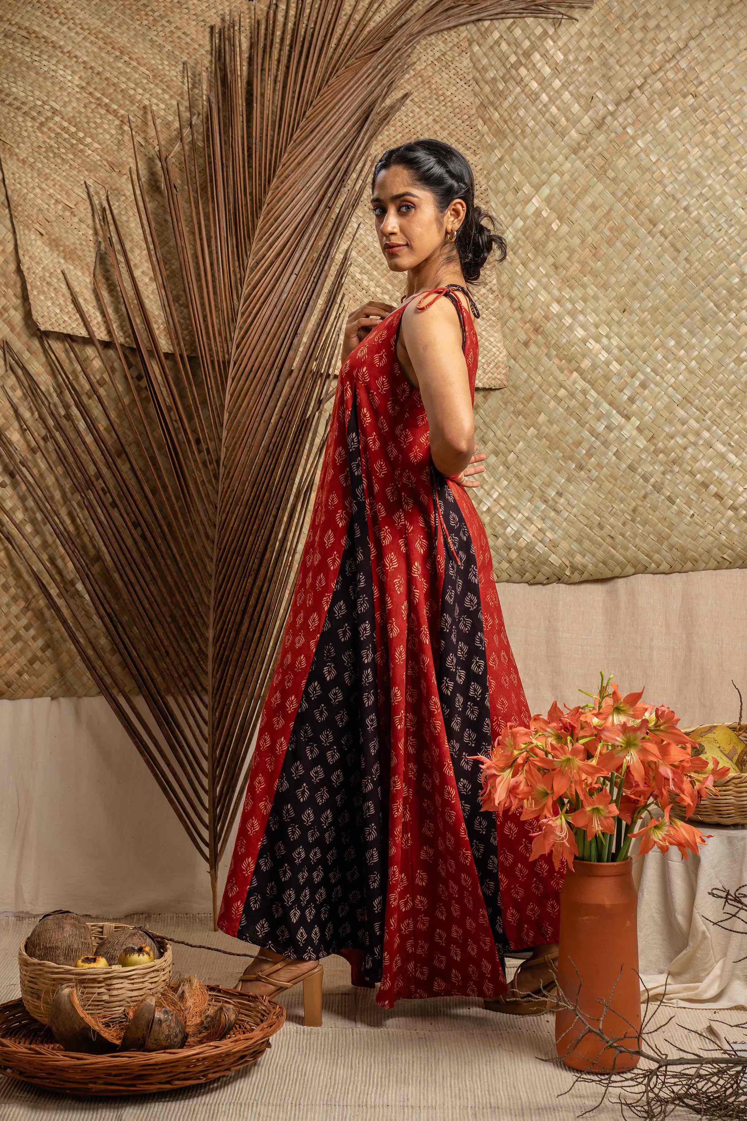 Turn heads in our bold red and black hand block printed panellled dress with a trendy tie at shoulder design