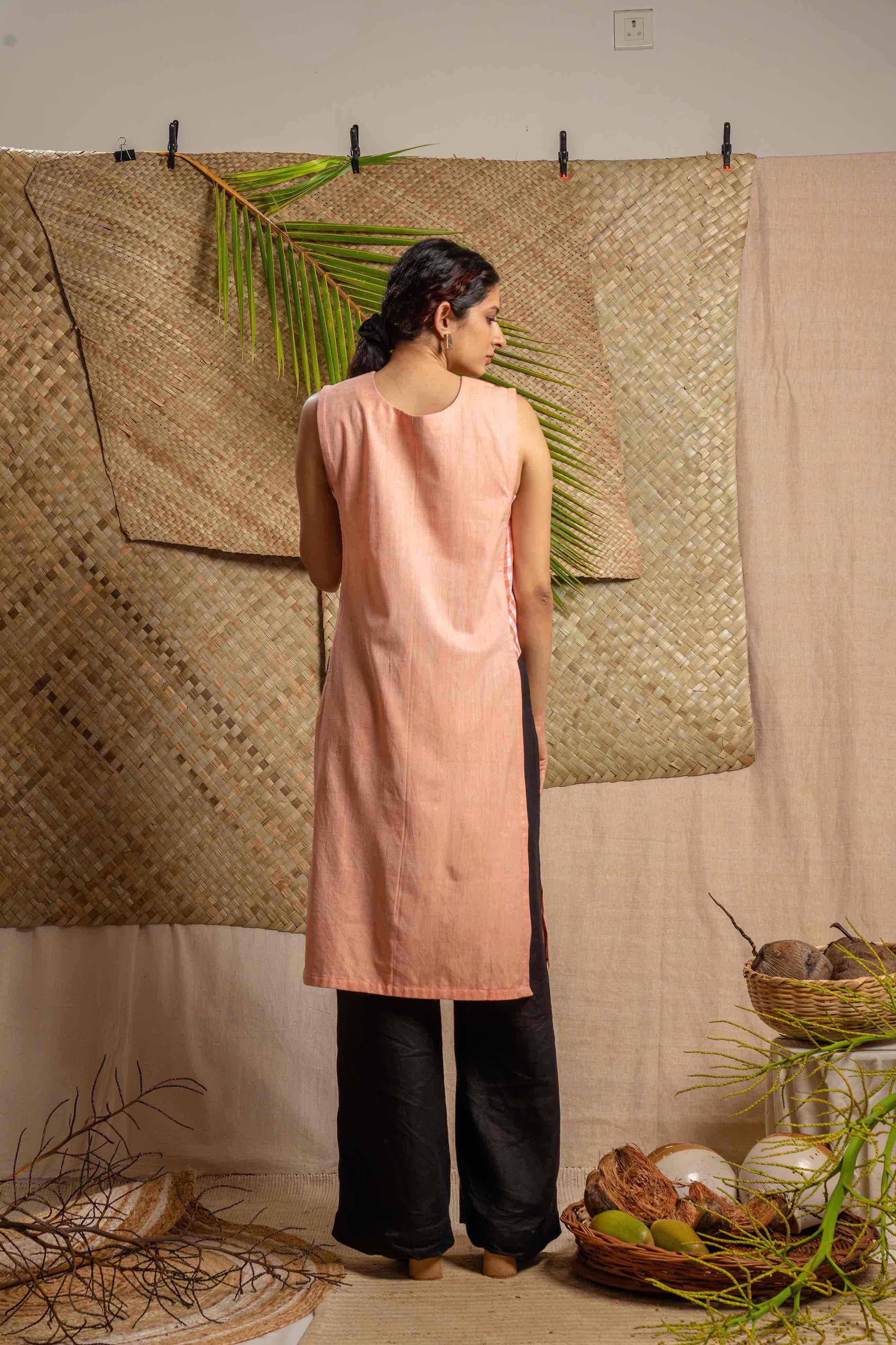 Peach perfection meets modern flair in our straight cut kurti with a checkered panel at sides