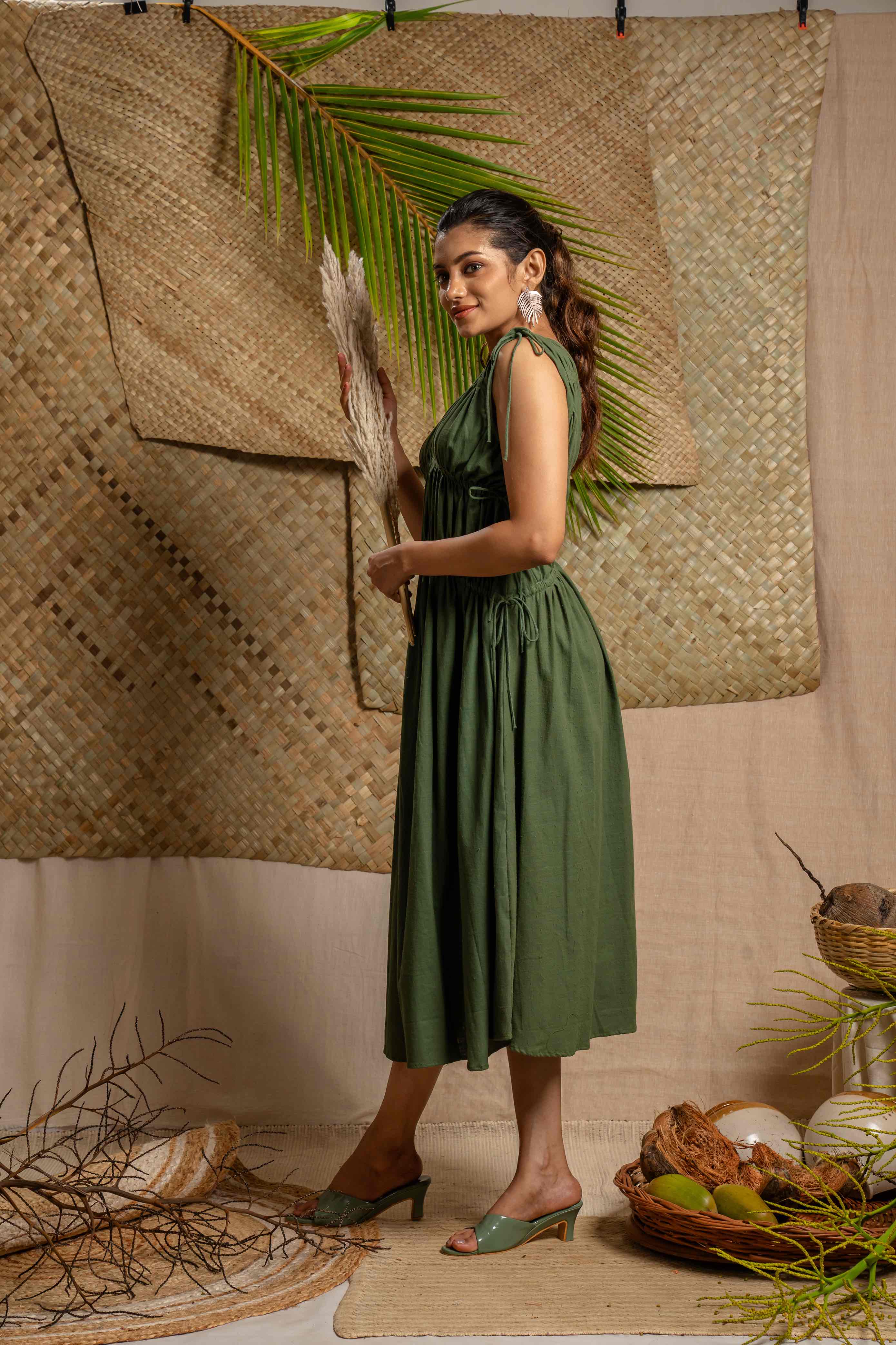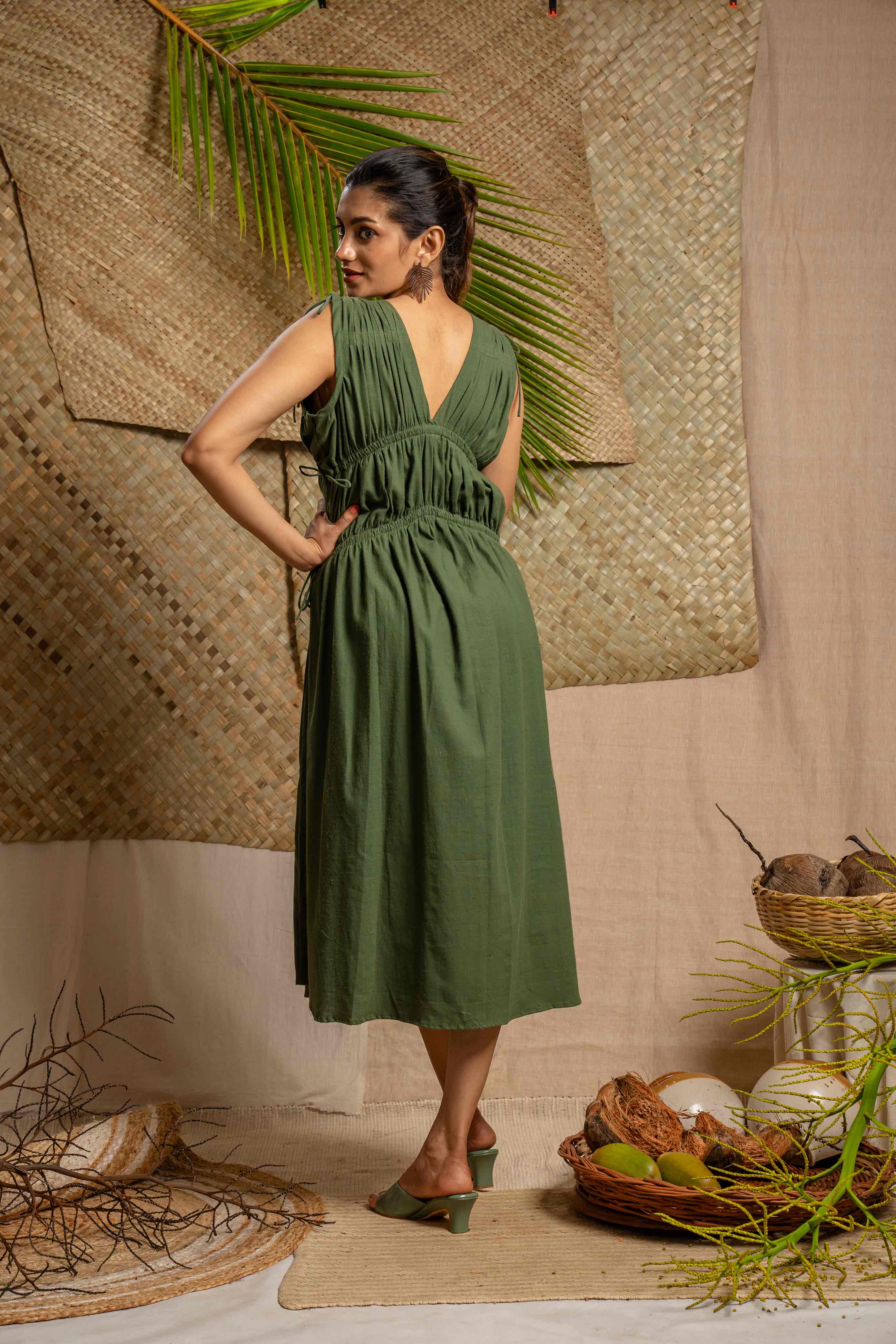 Elegant mid calf length green dress with adjustable tie details at bust and waist featuring a flowy silhouette and V neck line