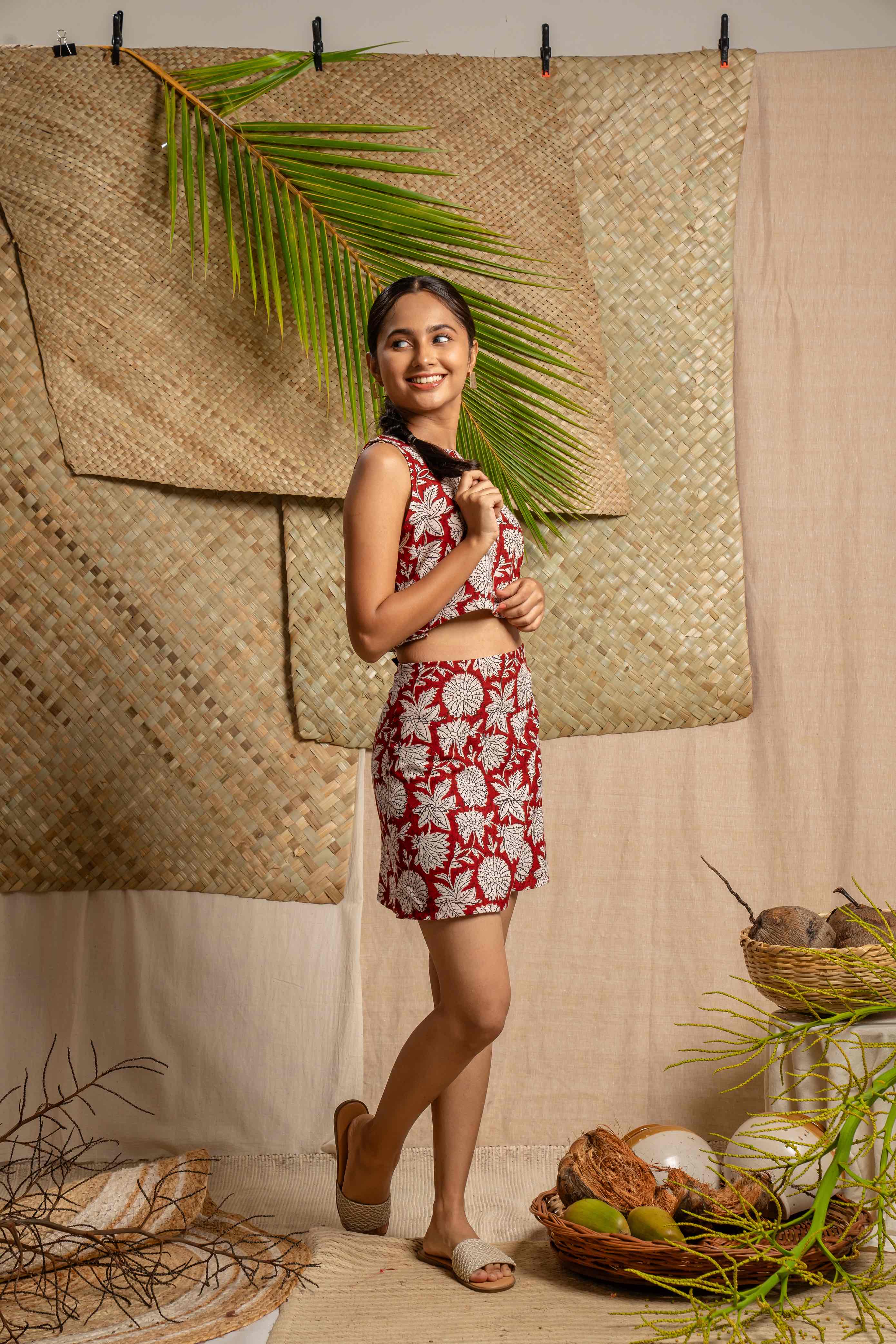 Vibrant red hand block printed co-ord set featuring a crop top and mini skirt percfect for making a statement.